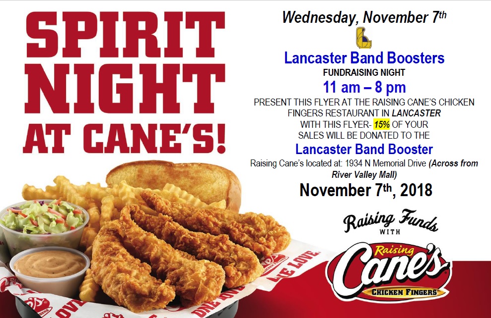 Today, Raising Cane’s in Lancaster will be donating 15% of sales to the Lancaster Band Boosters.