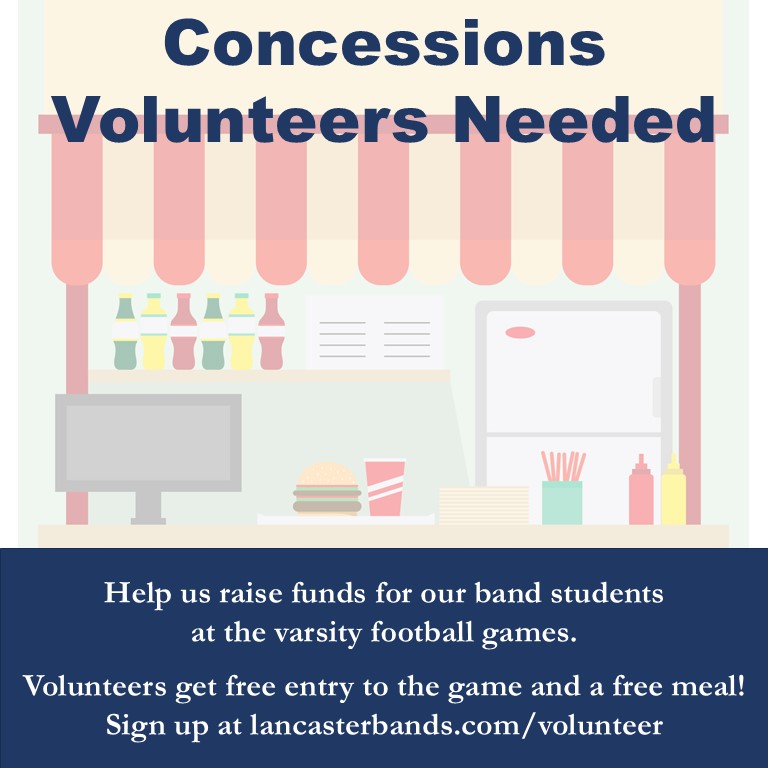 Our first football game is this Friday, August 23, and the concessions team is energized and ready to start raising funds for our students this season. We have exciting improvements to our menu and stand. Please consider helping out for a shift or two or more! We welcome any family members that are interested. Volunteers get free entry to the football game and a free meal. Go to lancasterbands.org/volunteer to sign up!